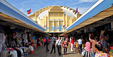 The Central Market is an Art Deco landmark of Phnom Penh, the capital of Cambodia. The bright yellow building completed in 1937 has a 26m high central dome, with four tall arch-roofed arms branching out diagonally across the block, creating vast hallways housing countless stalls and a variety of goods. Initially designed by city architect Jean Desbois, construction works were supervised by French architect Louis Chauchon. When it first opened in 1937, it was said to be the biggest market in Asia; today it still operates as a market.