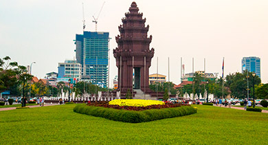 The Independence Monument in Phnom Penh, capital of Cambodia, was built in 1958 to memorialise Cambodia's independence from France in 1953. It stands on the intersection of Norodom Boulevard and Sihanouk Boulevard in the centre of the city. It is in the form of a lotus-shaped stupa, of the style seen at the Khmer temple at Banteay Srei and other Khmer historical sites. The Independence Monument was designed by the Cambodian architect Vann Molyvann, who was “personally selected and instructed” by Prince Norodom Sihanouk on how it should look like, combining “the religious and the secular.” It stands 37 metres tall.